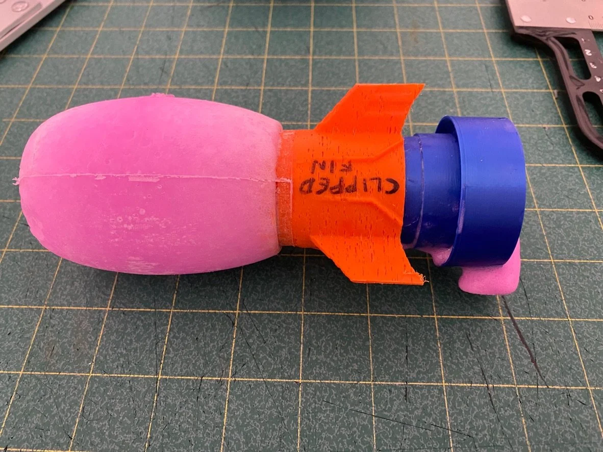 A critical design constraint was that the football was “easy to catch,” meaning that it needed to be soft when catching the ball from either side. The blue part of the ball was made of polyurethane foam so making sure that end of the ball was soft to catch simply meant adding enough padding of foam in the front. The tube, however, is made of a more rigid plastic. We sampled a variety of materials and associated durometers and then narrowed down to two versions. We then tested these versions with multiple people both in and out of the office to align on which material felt the most comfortable while still achieving the flight performance.